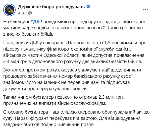 Бухгалтер воинской части в Одесской области подозревается в присвоении 2,3 млн грн выплат пропавших без вести бойцов.