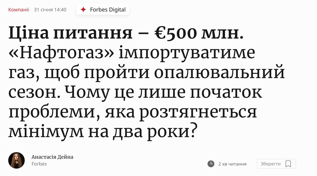 "Для уверенного прохождения отопительного сезона нужно было импортировать 1 млрд кубометров газа", – заявляет бывшая и.о. министра энергетики Ольга Буславец. Сейчас стоимость импорта такого объема составляет 500-550 млн евро.
