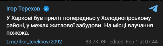 08:00 В Харькове был прилет предварительно в Холодногорском районе, в пределах жилой застройки, сообщает мэр города Игорь Терехов.
