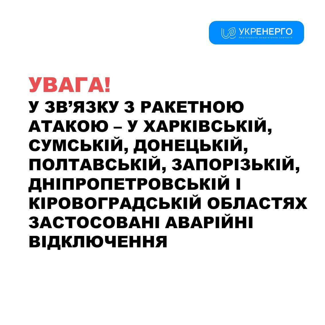 08:10 В связи с ракетной атакой – в Харьковской, Сумской, Полтавской, Донецкой, Днепропетровской, Запорожской, Кировоградской областях применены аварийные отключения.