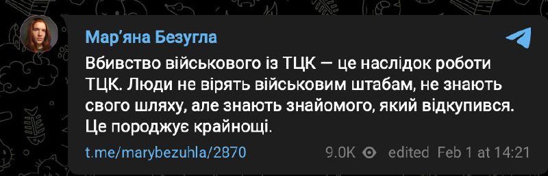"Убийство военного из ТЦК – это следствие работы ТЦК. Люди не верят военным штабам, не знают своего пути, но знают откупившегося знакомого. Это рождает крайности", - написала Безуглая.