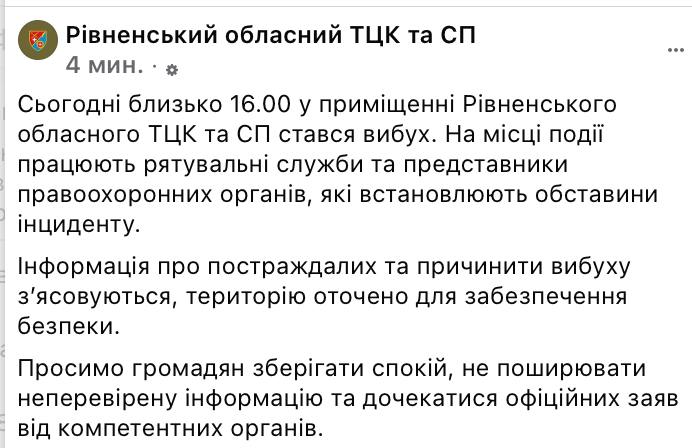 В свою очередь Ровенский областной военкомат подтверждает, что взрыв произошел внутри ТЦК, и заявляет что обстоятельства выясняются.