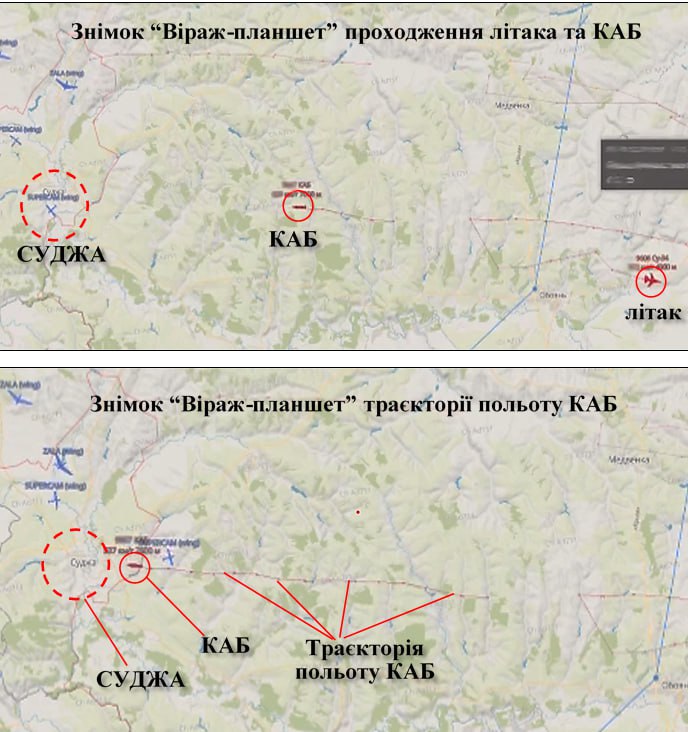 Вашему вниманию скриншоты из системы "Вираж-планшет" с траекторией полета российской управляемой авиационной бомбы", - пишут Воздушные силы.