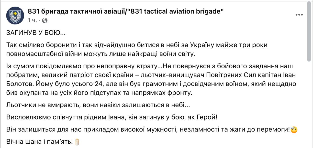 14.27 В бою погиб летчик-истребитель, 24-летний капитан Воздушных сил Иван Болотов. Он воевал с начала вторжения.