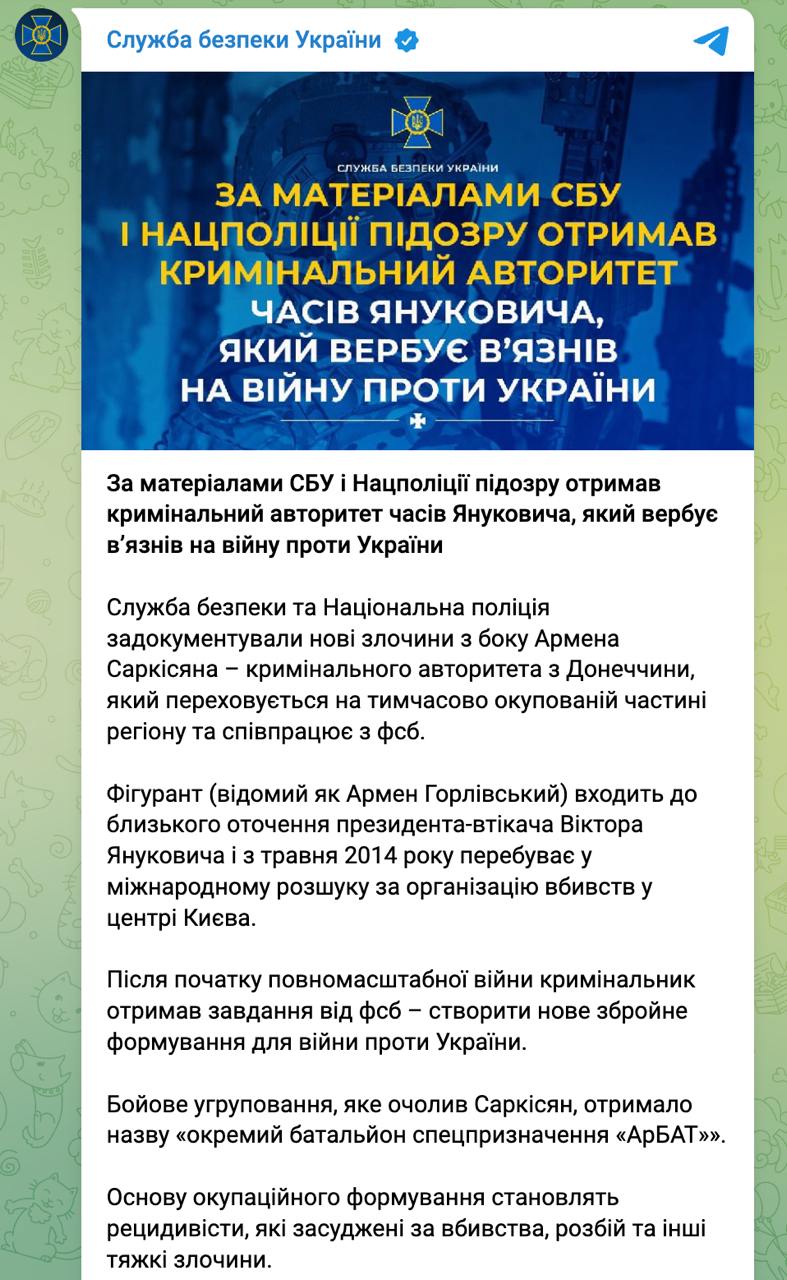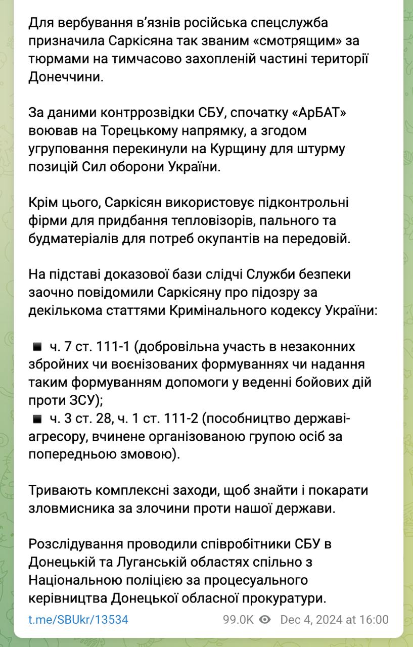 Главное управление разведки заявляло, что Саркисян, также известный как Армен Горловский, – это криминальный авторитет из Горловки, близкий к семье Виктора Януковича. Он родился в столице Армении Ереване и во времена Януковича считался одним из самых крупных криминальных авторитетов в Донецкой области, имел большое влияние на ситуацию в Горловке.