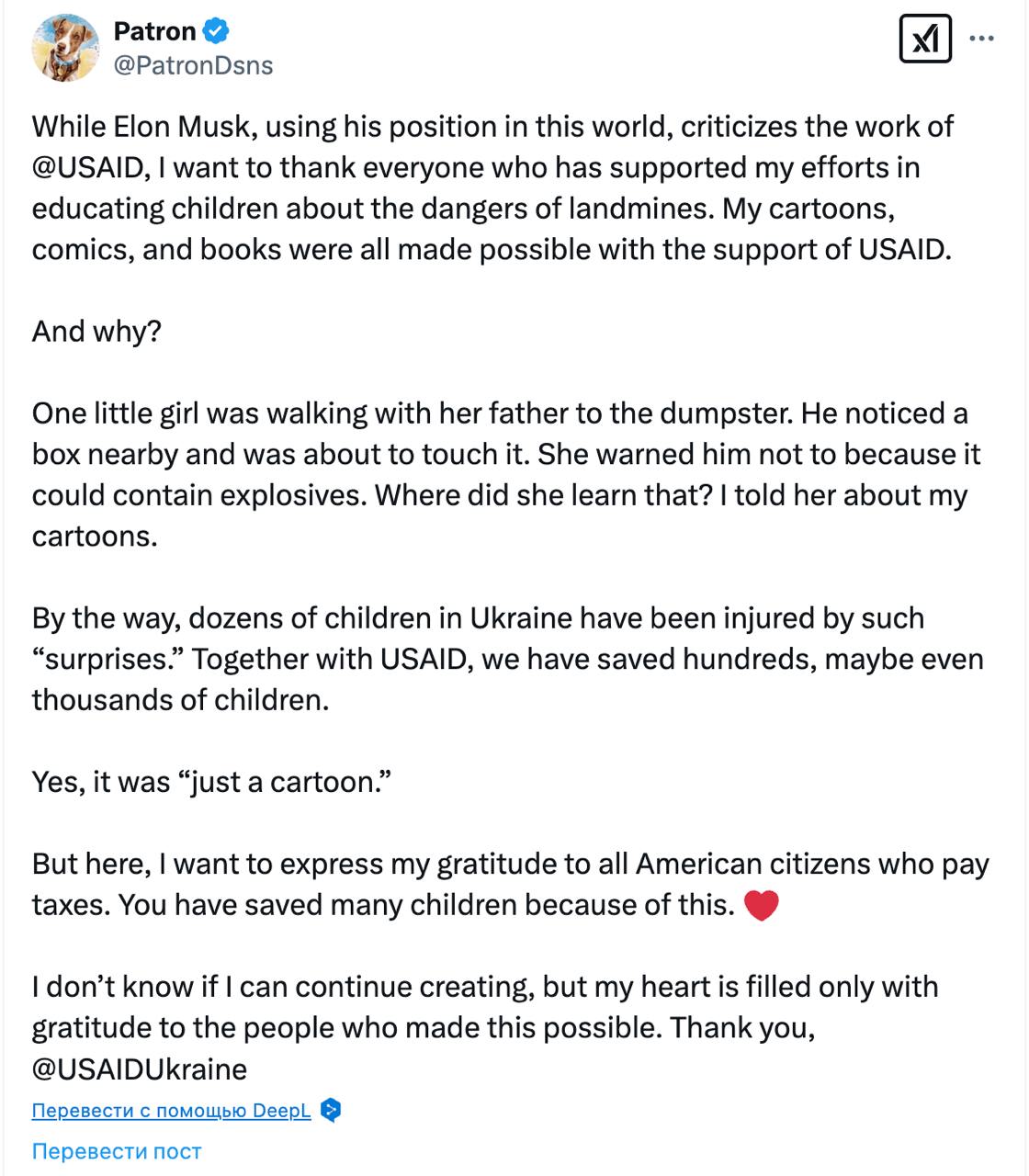 "Пока Илон Маск, пользуясь своим положением в этом мире, критикует работу USAID, я хочу поблагодарить всех, кто поддержал мои усилия по просвещению детей об опасности противопехотных мин. Мои мультфильмы, комиксы и книги стали возможны благодаря поддержке USAID. ...Десятки детей в Украине пострадали от таких "сюрпризов" (мин - Ред.). Вместе с USAID мы спасли сотни, может быть, даже тысячи детей. ...Я хочу выразить свою благодарность всем гражданам Америки, которые платят налоги. Благодаря этому вы спасли многих детей. Не знаю, смогу ли я продолжать творить, но мое сердце наполнено только благодарностью к людям, которые сделали это возможным. Спасибо, USAIDUkraine", - сказано в публикации Патрона.