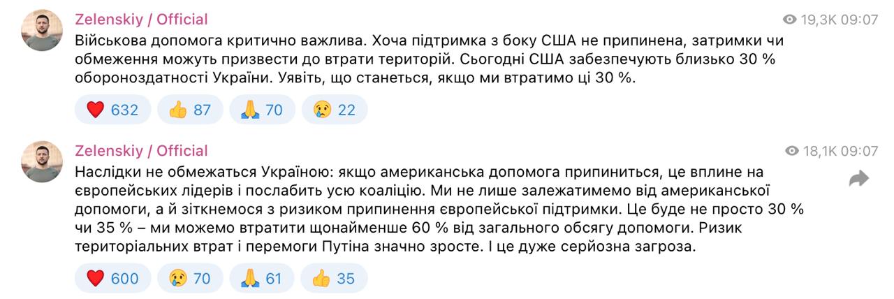 "Если американская помощь прекратится, это окажет влияние на европейских лидеров и ослабит всю коалицию. Мы будем не только зависеть от американской помощи, но и столкнемся с риском прекращения европейской поддержки. Это будет не просто 30% или 35% – мы можем потерять не менее 60% общего объема помощи. Риск территориальных потерь и побед Путина значительно возрастет", - заявил Зеленский.