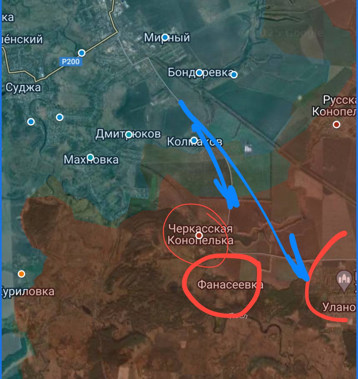 Z-каналы полагают, что цель удара - занять обратно недавно потерянную Черкасскую Конопельку и выйти в тыл войскам РФ, наступающим в районе Гуево. И заодно обезопасить трассу снабжения из Сум.