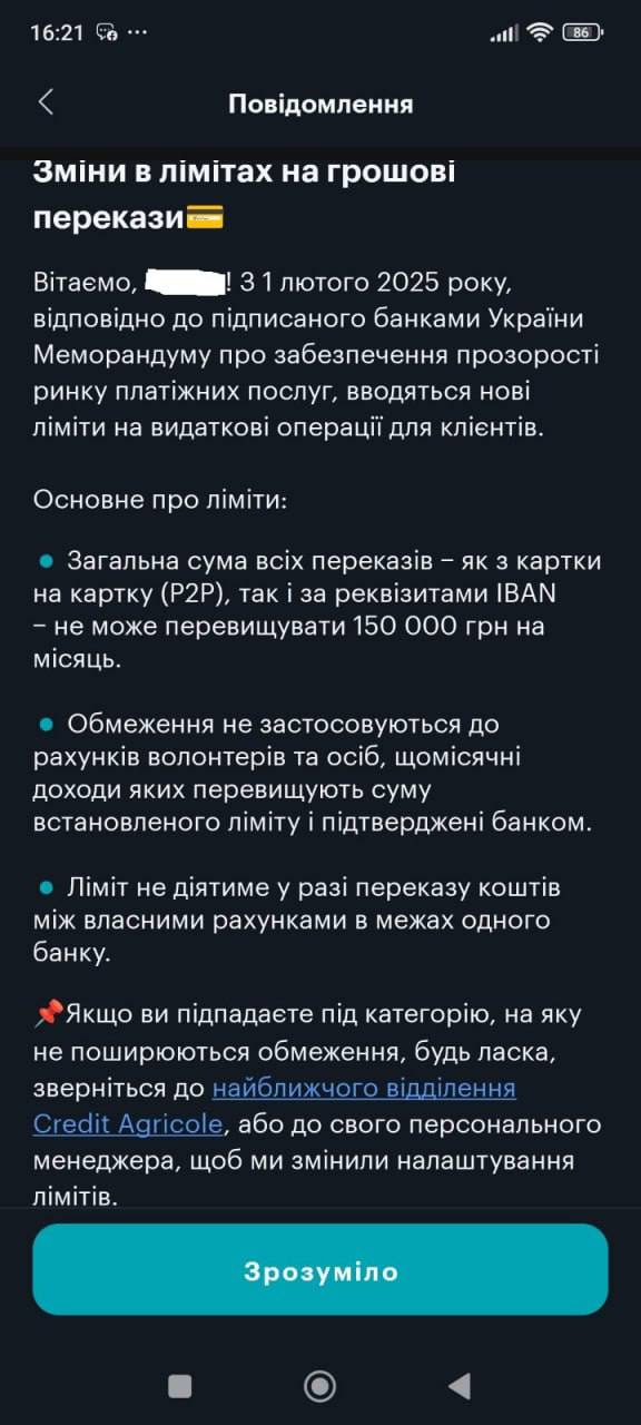 Интересно, что в "Креди Агриколь Банк" сообщили клиентам о введении лимита на переводы в размере 150 тысяч гривен в месяц, в который войдут два вида перечислений: Р2Р (по номеру карты) и IBAN (по номеру счета) - с уже известными исключениями для переводов между собственными счетами в одном банке, для волонтеров и получателей официального дохода выше указанного лимита. При этом в сообщении "Агриколя" ничего не говорится о нижней планке платежного ограничения в 50 тысяч гривен в месяц, хотя в меморандуме указан диапазон перечислений в рамках 50-150 тысяч гривен в зависимости от характеристики каждого отдельно взятого клиента (высокорисковый либо средне- и низкорисковый).