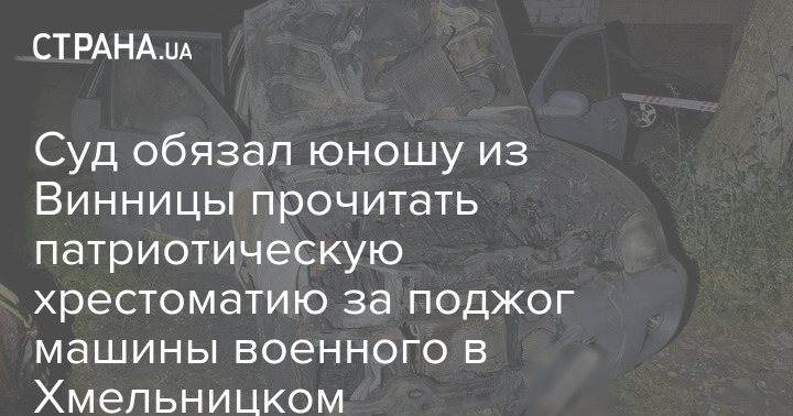 В Хмельницком 17-летний юноша из Винницы совершил поджог автомобиля военного, за что Хмельницкий горрайонный суд назначил ему условное наказание, обязав прочитать книгу "С Украиной в сердце. Патриотическая хрестоматия".