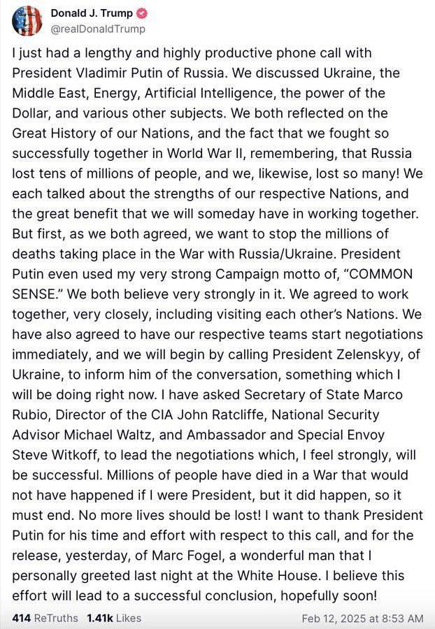 "У меня только что был долгий и очень продуктивный телефонный разговор с президентом России Владимиром Путиным. Мы обсудили Украину, Ближний Восток, энергетику, искусственный интеллект, силу доллара и другие темы. Мы оба размышляли о великой истории наших наций и о том, что мы так успешно сражались вместе во Второй мировой войне, вспоминая, что Россия потеряла десятки миллионов людей, и мы также потеряли так много!