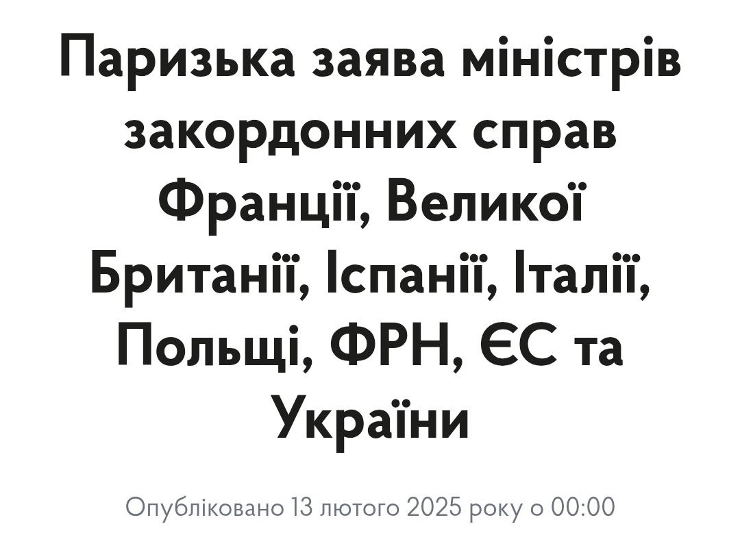 Под ним подписались министры иностранных дел Украины, Франции, Германии, Великобритании, Италии, Испании, Польши и ЕС.
