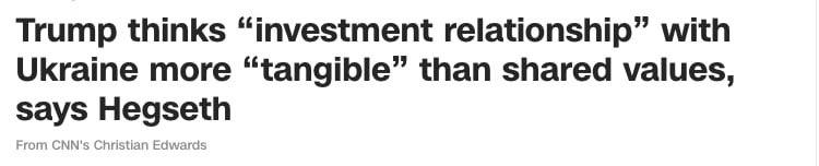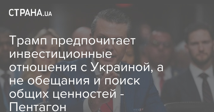 "Президент Трамп как переговорщик и бизнесмен признает, что инвестиционные отношения с Украиной в конечном итоге в долгосрочной перспективе для Соединенных Штатов гораздо более осязаемы, чем любые обещания или общие ценности, которые у нас могут быть – даже если они у нас есть", – сказал Хегсет на брифинге в Брюсселе.