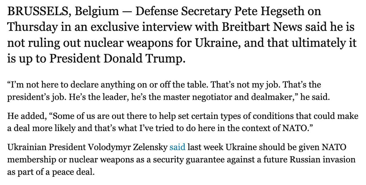 Также в пабликах расходится новость, что глава Пентагона Пит Хегсет не исключил передачи Украине ядерного оружия.