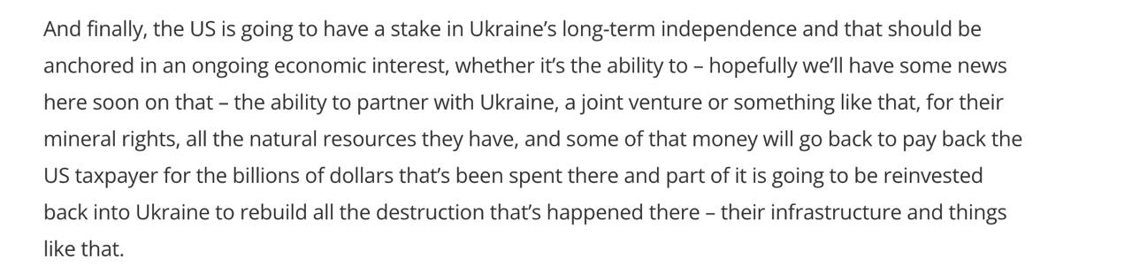 Среди них он перечислил "возможность сотрудничать с Украиной, создать совместное предприятие или что-то в этом роде, для получения прав на добычу их полезных ископаемых, всех природных ресурсов, которые у них есть".