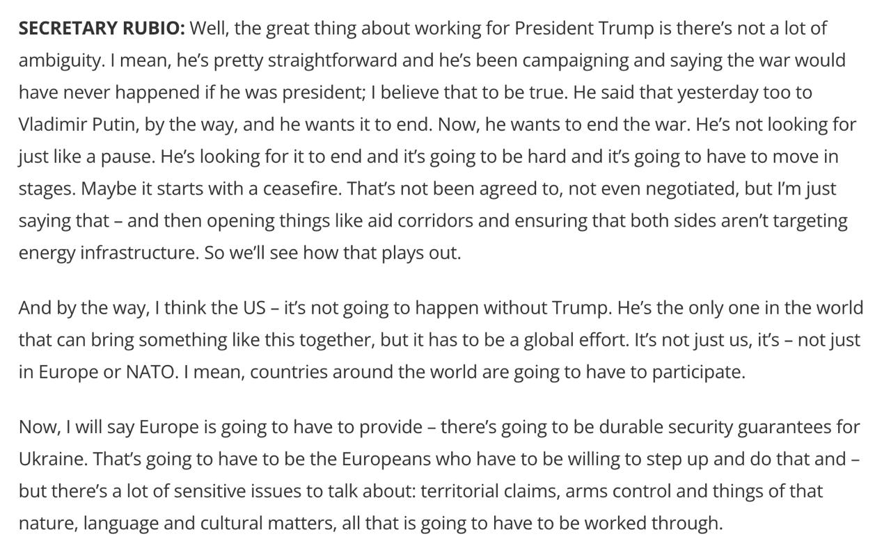 "Может быть, это начнется с прекращения огня. Это не было согласовано, даже не обсуждалось, но я просто говорю об этом, а затем открыть такие вещи, как коридоры помощи, и обеспечить, чтобы обе стороны не нацеливались на энергетическую инфраструктуру. Так что посмотрим, что из этого выйдет", - заявил Рубио.