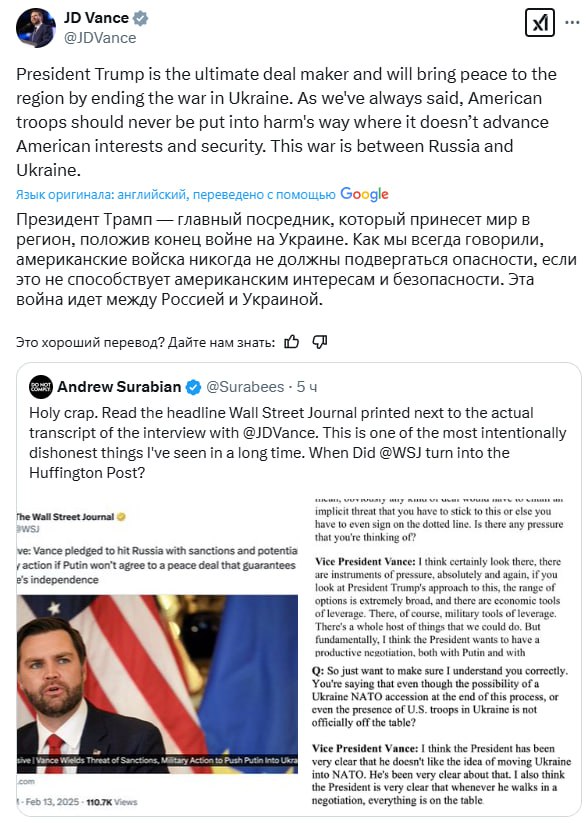 Вице-президент США Джей Ди Вэнс опроверг публикацию американской газеты The Wall Street Journal, в которой со ссылкой на него заявлялось, что американские войска могут ввести в Украину, если Владимир Путин не согласится на мирный план.