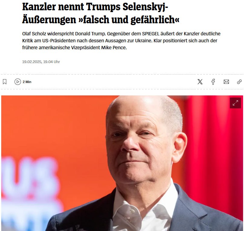 Канцлер Германии Олаф Шольц подверг критике президента США Дональда Трампа за то, что последний назвал украинского президента Владимира Зеленского "диктатором без выборов".