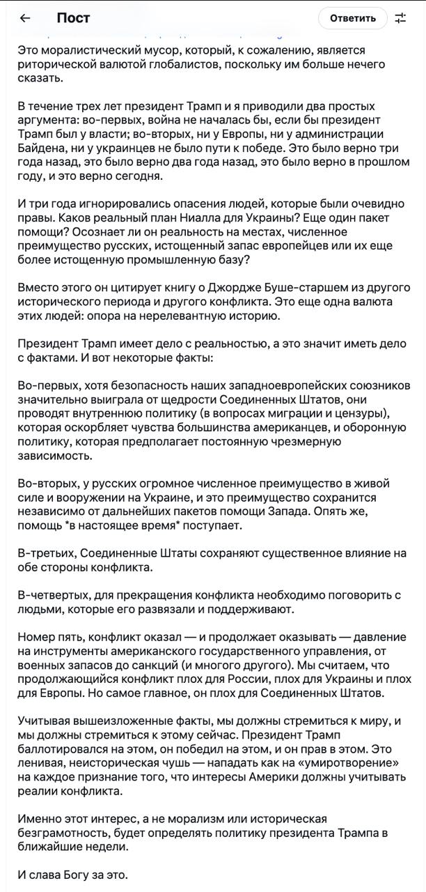 "Учитывая вышеизложенные факты, мы должны стремиться к миру, и мы должны стремиться к этому сейчас. Президент Трамп баллотировался с этим, он победил с этим, и он прав в этом. Это ленивая, неисторическая чушь - нападать как на "умиротворение" ("умиротворение агрессора" - одно из обвинений сейчас в адрес Трампа, который хочет закончить войну в Украине на компромиссной основе - Ред.), на признание того, что интересы Америки должны учитывать реалии конфликта. Именно этот интерес, а не морализм или историческая безграмотность, будет определять политику президента Трампа в ближайшие недели", - заявил Вэнс.
