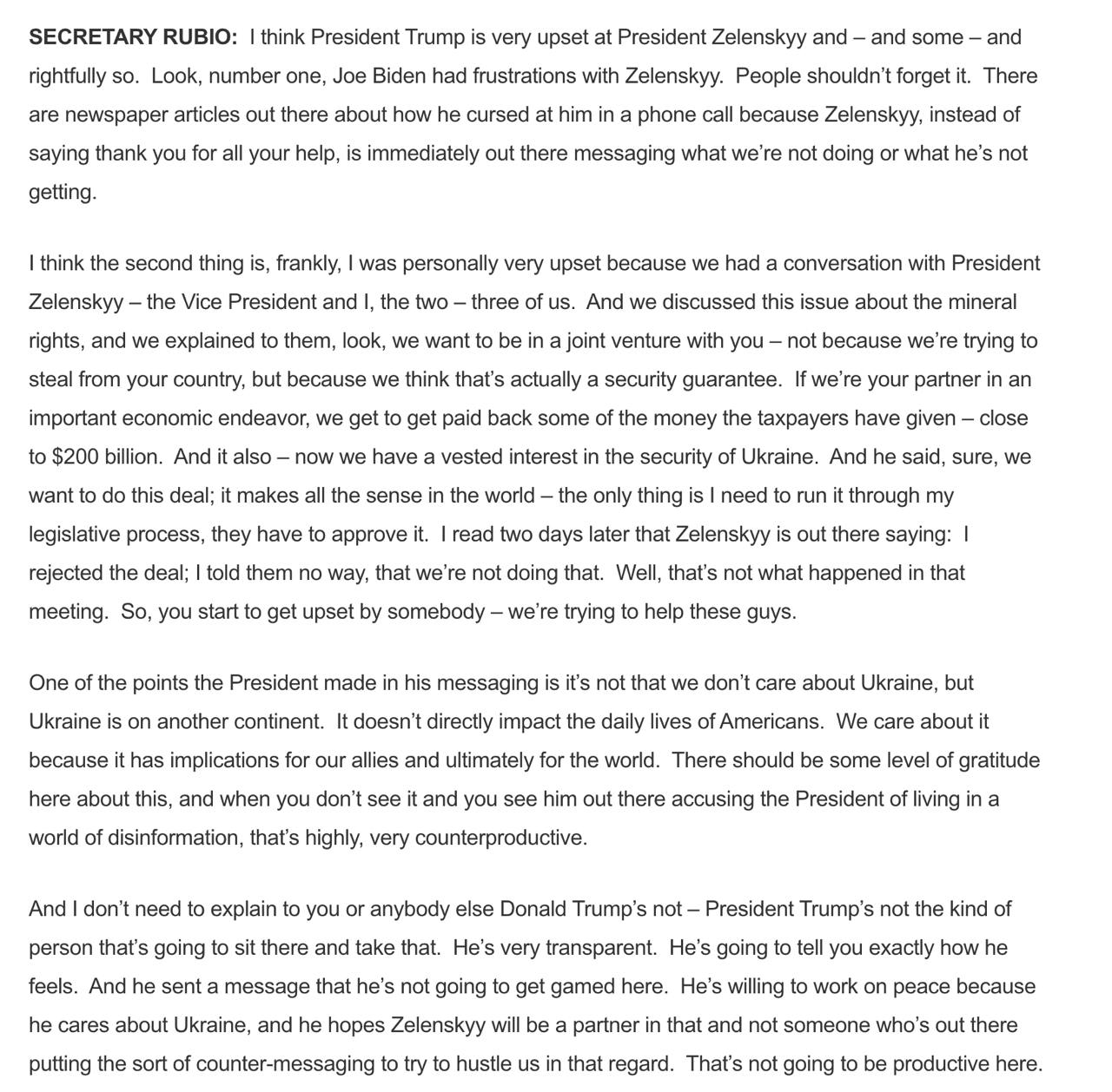 "Я прочитал два дня спустя, что Зеленский там говорит: я отклонил сделку; я сказал им, что ни в коем случае мы этого не сделаем. Ну, это не то, что произошло на той встрече. Итак, вас кто-то начинает расстраивать — мы пытаемся помочь этим ребятам", - говорит Рубио.