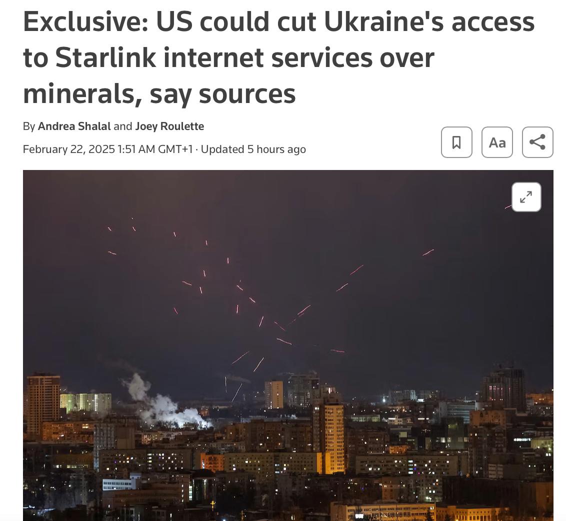 "Украине дали понять, что доступ к Starlink может быть немедленно отключен, если не будет достигнута сделка по критически важным полезным ископаемым", - пишет агентство.