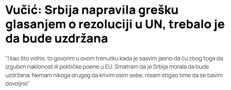 "И, как вы видите, я говорю это в то время, когда совершенно ясно, что из-за этого я потеряю расположение или политические очки в ЕС. Я думаю, Сербии следовало воздержаться. Мне некого винить, кроме себя, у меня не было времени разобраться с этим в достаточной степени", – сказал Вучич.