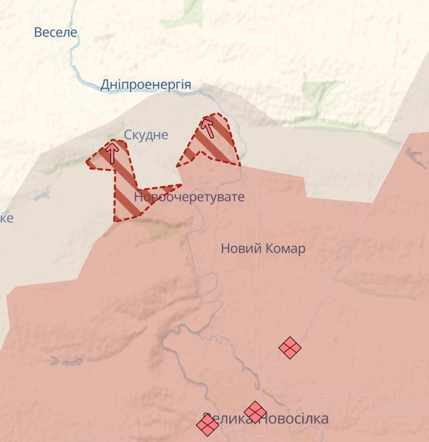 "После захвата поселка россияне начали осуществлять накопление своих ресурсов, перегруппировываться и восстановили свою активность. Наибольшее давление осуществляется в направлении Скудного и Бурлацкого. За это время противник оккупировал полностью Новый Комар и занял значительную часть Новоочареватого. Подобрался по посадкам почти вплотную к Бурлацкому и продолжает свое давление", – пишет паблик.