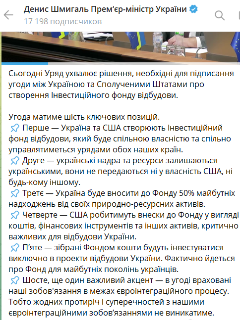 "В скором времени Украина сделает важный шаг в рамках реализации плана победы. Будет подписано соглашение с США о создании Инвестиционного фонда восстановления... Сегодня правительство принимает решения, необходимые для подписания соглашения между Украиной и Соединенными Штатами", - заявил Шмыгаль.