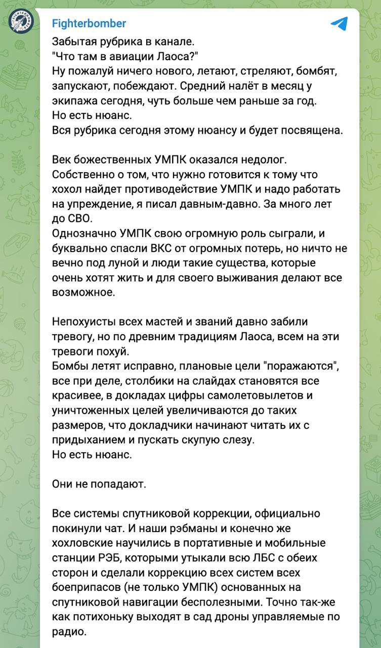 11:35 "Они не попадают". Украина нашла противодействие российскими планирующим КАБам, пишет российский военный авиационный паблик Fighterbomber.
