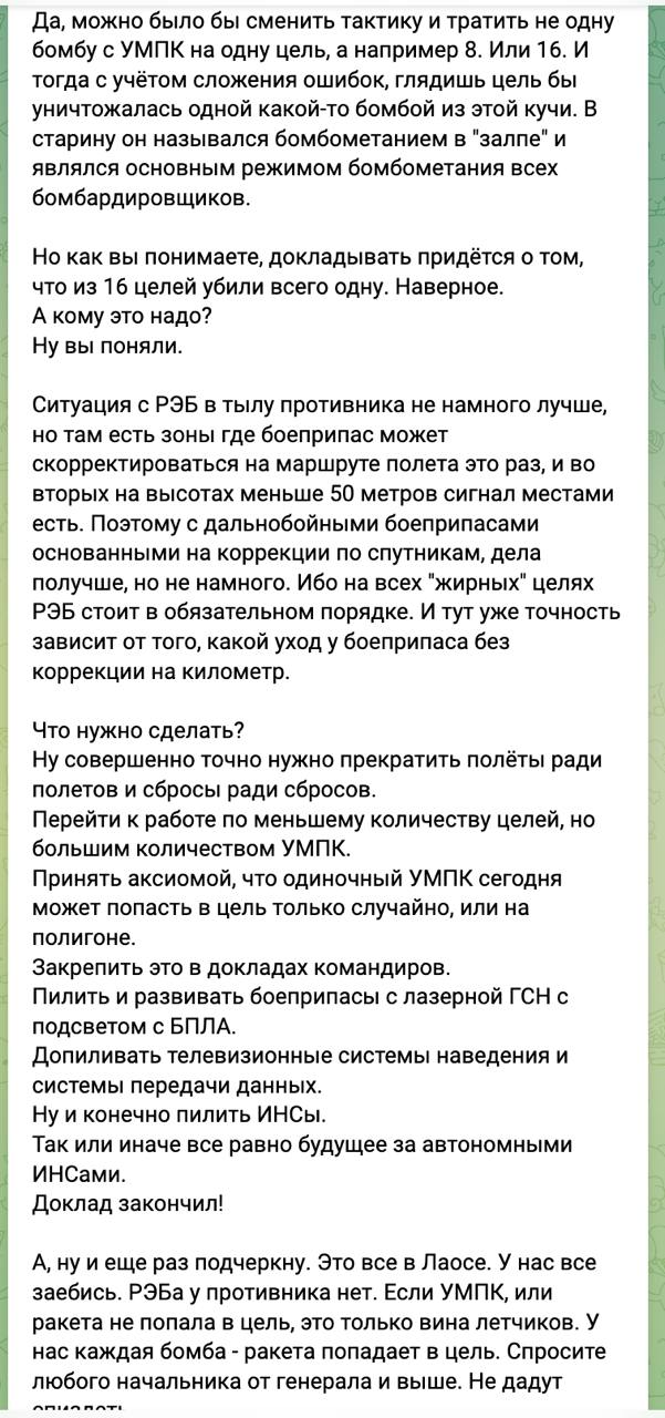 Также он пишет, что из-за совершенствования радиоэлеткронных средств постепенно нивелируется эффективность дронов, управляемых по радиосвязи у обоих воюющих армий. И будущее в целом за системами, которые имеют встроенные механизмы самонаведения, не связанные со спутниками.