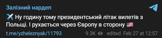 Самолет президента Украины Владимира Зеленского вылетел из Польши и летит через Европу в сторону США. Об этом сообщает народный депутат Ярослав Железняк.