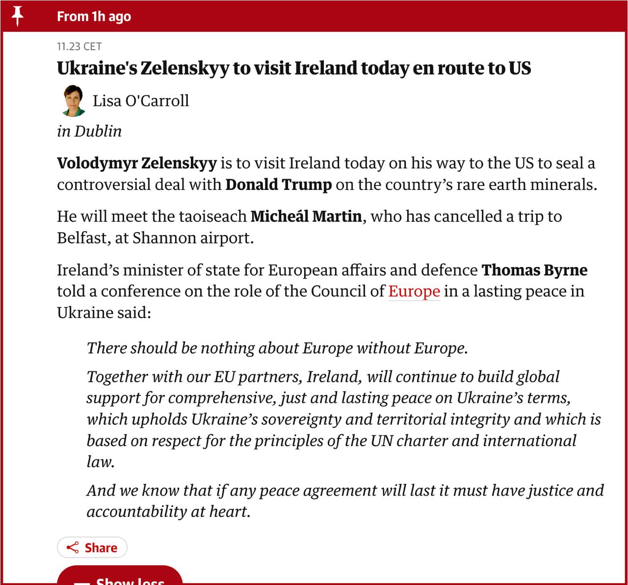 Издание The Guardian пишет, что президент Украины сегодня посетит Ирландию по дороге в США. Сообщается, что премьер Михол Мартин ради этой встречи в аэропорту "Шаннон" отменил поездку в Белфаст.