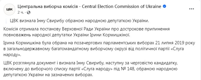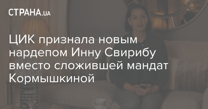 Центральная избирательная комиссия признала Инну Свирибу избранным народным депутатом Украины, получив постановление Верховной Рады о досрочном прекращении полномочий народного депутата Ирины Кормышкиной (также известна под фамилией Аллахвердиева).
