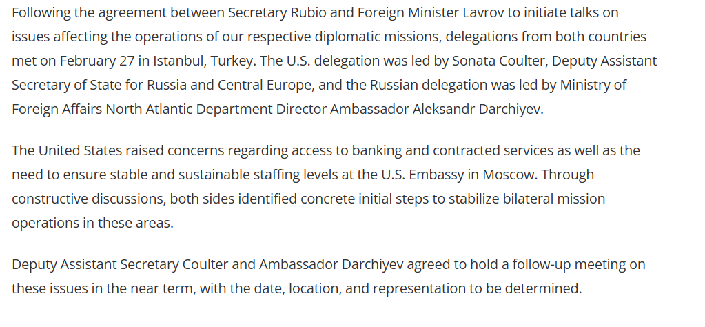 США и Россия обсудили деятельность своих дипломатических миссий во время вчерашних переговоров в Стамбуле.