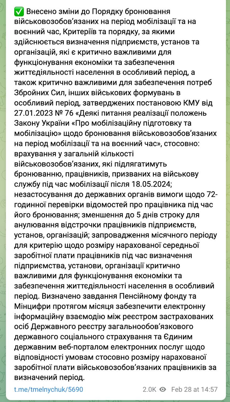 Кабинет министров внес изменения в порядок бронирования военнообязанных граждан от мобилизации. Изменения касаются критериев и порядка определения предприятий и организаций как критически важных для экономики.