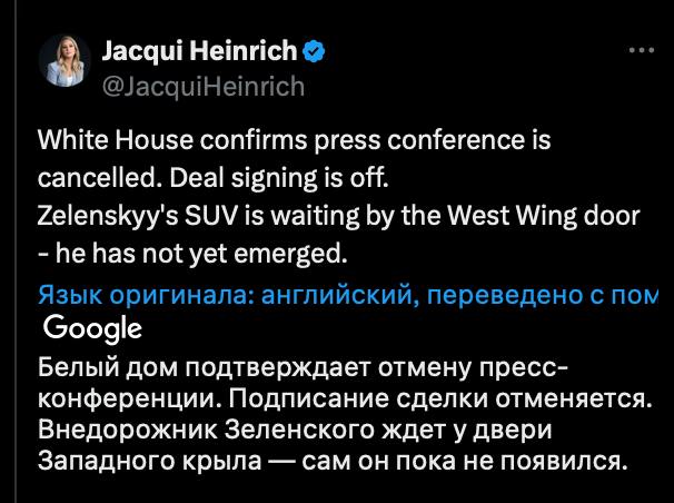 Между тем журналистка телеканала Fox News Джеки Генрих написала в Х, что пресс-конференцию Зеленского и Трампа после встречи отменили, а подписание сделки о недрах не состоится.