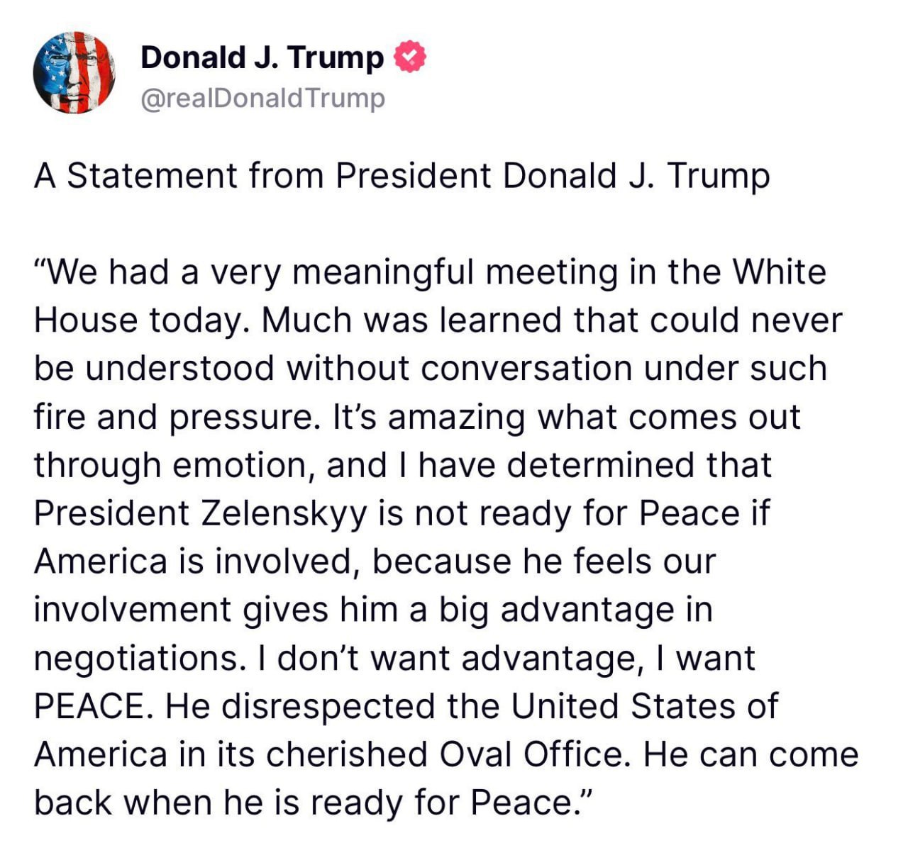 "Сегодня у нас была очень значимая встреча в Белом доме. Было извлечено многое, что никогда не могло быть понято без разговора под таким огнём и давлением. Удивительно, что проявляется через эмоции, и я пришёл к выводу, что президент Зеленский не готов к миру, если Америка участвует, потому что он считает, что наше участие даёт ему большое преимущество в переговорах. Я не хочу преимущества, я хочу МИРА. Он проявил неуважение к Соединённым Штатам Америки в их священном Овальном кабинете. Он может вернуться, когда будет готов к миру", - сказано в публикации.