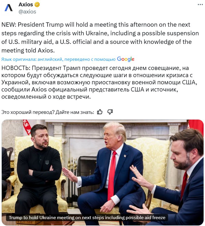 18.55 Трамп может полностью приостановить военную помощь Киеву на сегодняшнем совещании по урегулированию конфликта в Украине, сообщает Axios со ссылкой на источники.