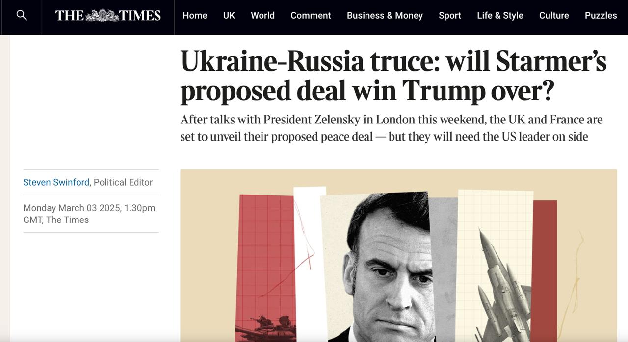 Также The Times со ссылкой на источник в британском правительстве сообщила, что Лондон давит на Зеленского, чтобы он сделал всё возможное для восстановления отношений с США после конфликта с Трампом в Белом доме.