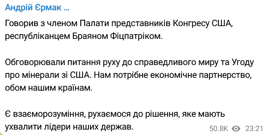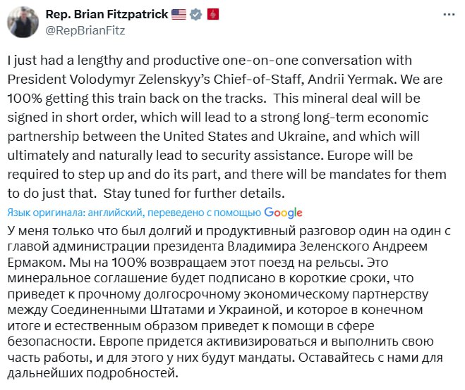 "У меня только что был долгий и продуктивный разговор один на один с главой администрации президента Владимира Зеленского Андреем Ермаком. Мы на 100% возвращаем этот поезд на рельсы. Это минеральное соглашение будет подписано в короткие сроки, что приведет к прочному долгосрочному экономическому партнерству между Соединенными Штатами и Украиной, и которое в конечном итоге и естественным образом приведет к помощи в сфере безопасности. Европе придется активизироваться и выполнить свою часть работы, и для этого у них будут мандаты", – написал Фицпатрик.