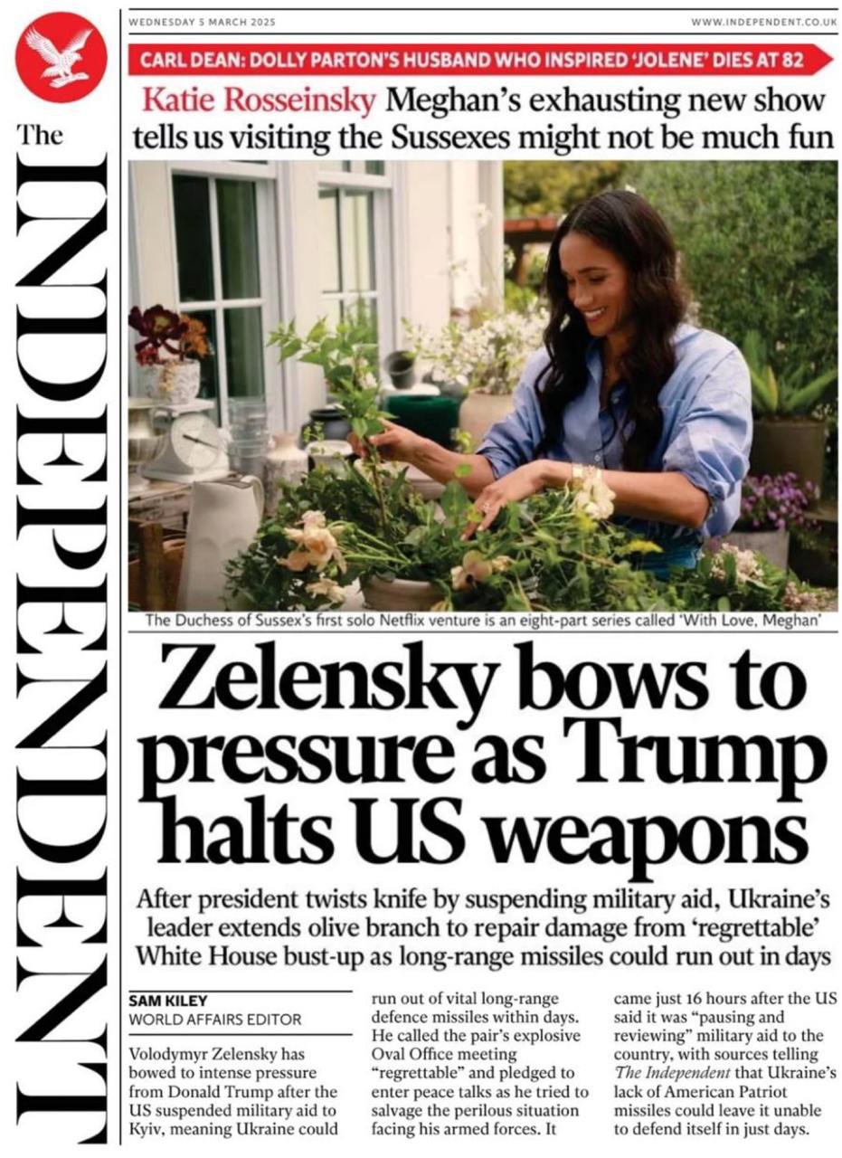 Издание The Independent вышло с заголовком на первой странице: "Зеленский уступает давлению, поскольку Трамп прекращает поставки оружия США".