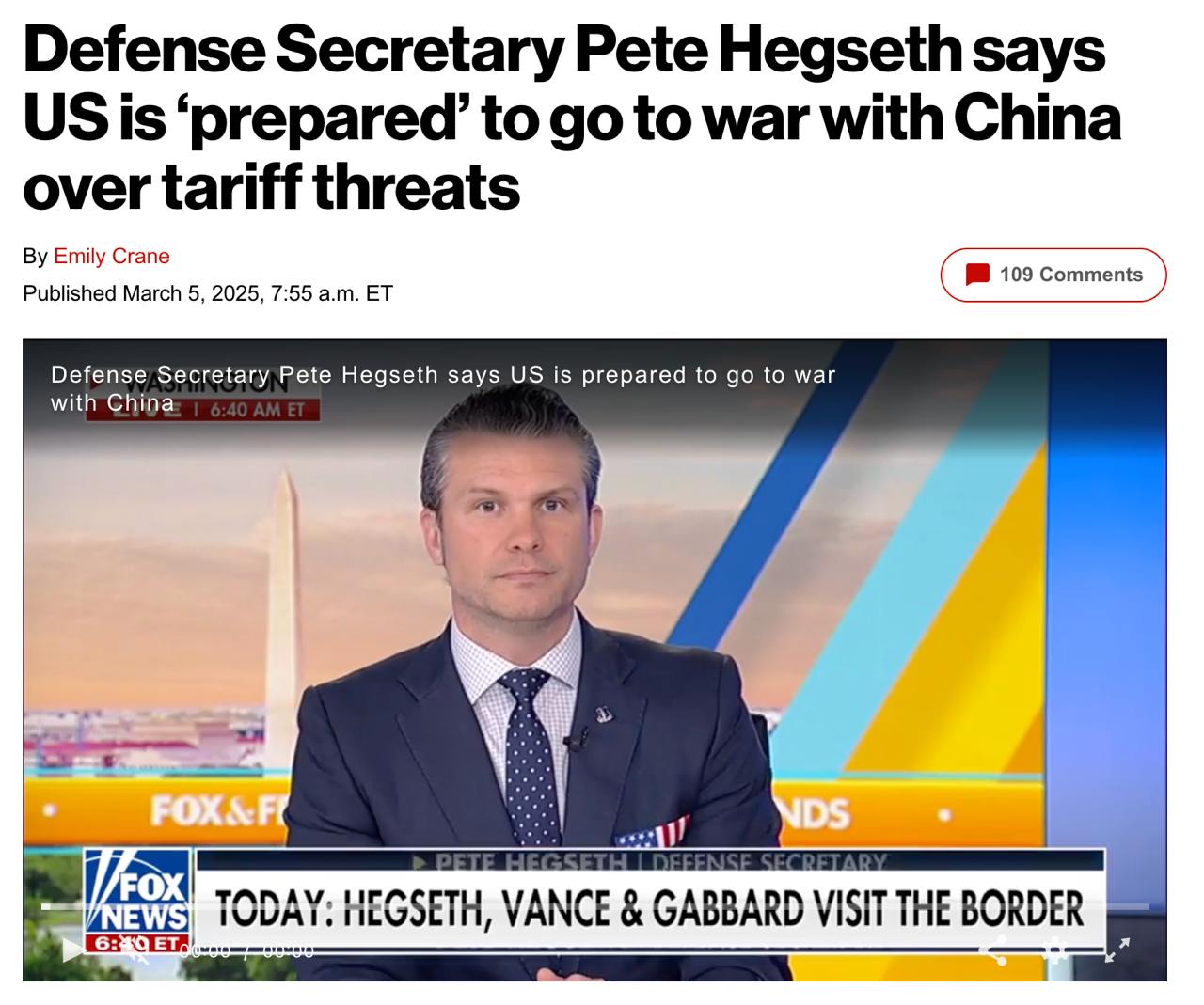 Министр обороны США Пит Хегсет заявил, что Вашингтон готов начать войну с Китаем из-за угроз введения пошлин.
