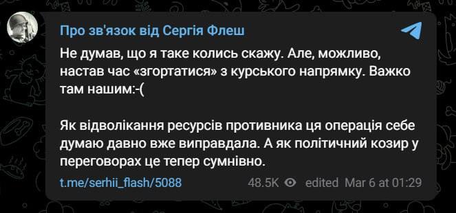 "Возможно, пора "сворачиваться" с курского направления. Трудно там нашим. Как отвлечение ресурсов противника эта операция себя, думаю, давно уже оправдала. А как политический козырь в переговорах это сейчас сомнительно", - пишет Флэш.