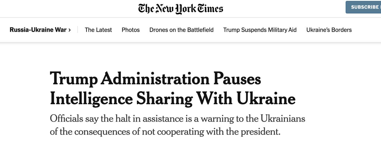 11:45 The New York Times подтверждает информацию, что американцы перестали передавать Украине оповещения о российских ударах беспилотников и ракет. Также ВСУ перестала поступать разведывательная информация, необходимая для нанесения ударов.