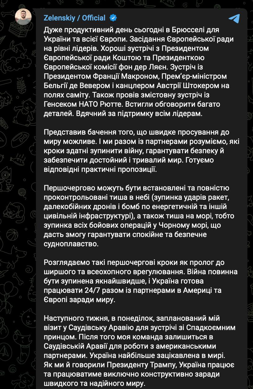 "На следующей неделе в понедельник запланирован мой визит в Саудовскую Аравию для встречи с Наследным принцем. После этого моя команда останется в Саудовской Аравии для работы с американскими партнерами. Украина больше всего заинтересована в мире", - сказал украинский президент.