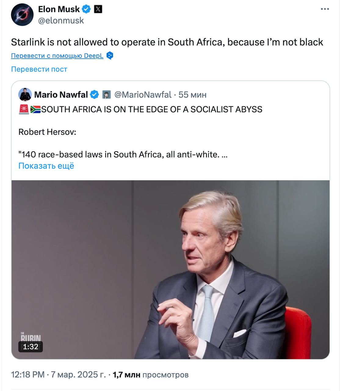 "Starlink не позволено работать в Южной Африке, потому что я не черный", - написал миллиардер.