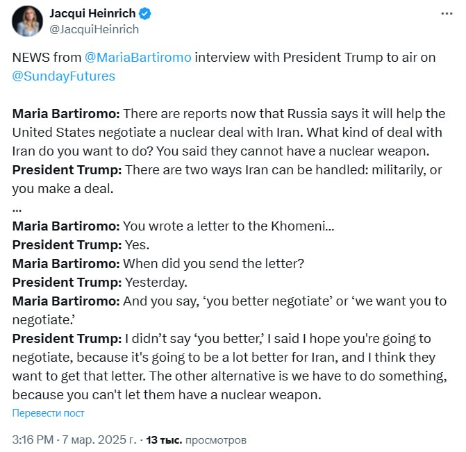 Об этом глава США заявил в интервью изданию Sunday Futures, пишет репортёр Fox News Джеки Гейнрих на своей старнице в Фейсбуке.