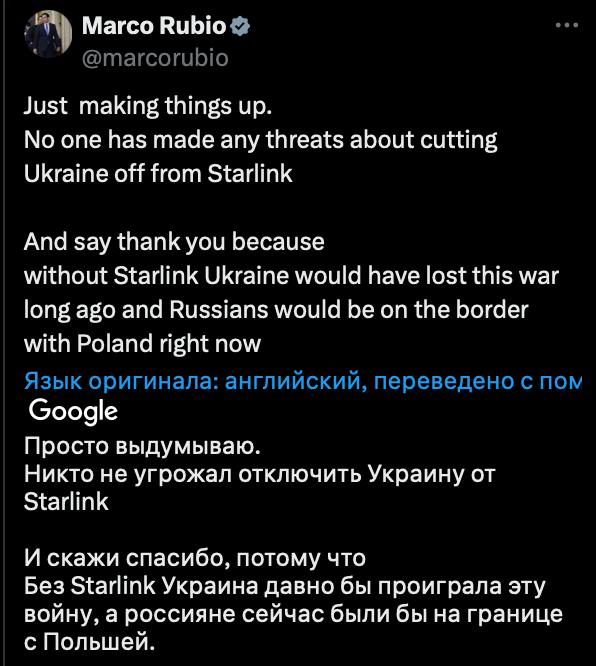 "Никто не угрожал отключить Украину от Starlink. И скажите спасибо, потому что без Starlink Украина давно бы проиграла эту войну, а россияне сейчас были бы на границе с Польшей", – написал представитель Белого дома.