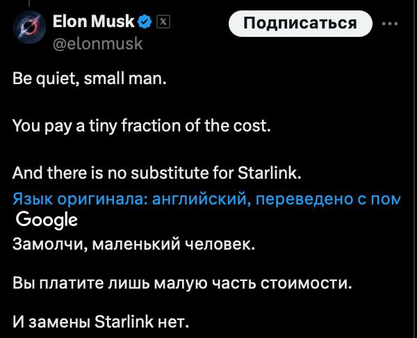 "Помолчи, маленький человек. Вы платите лишь малую часть стоимости. И замены Starlink нет", – написал владелец компании.