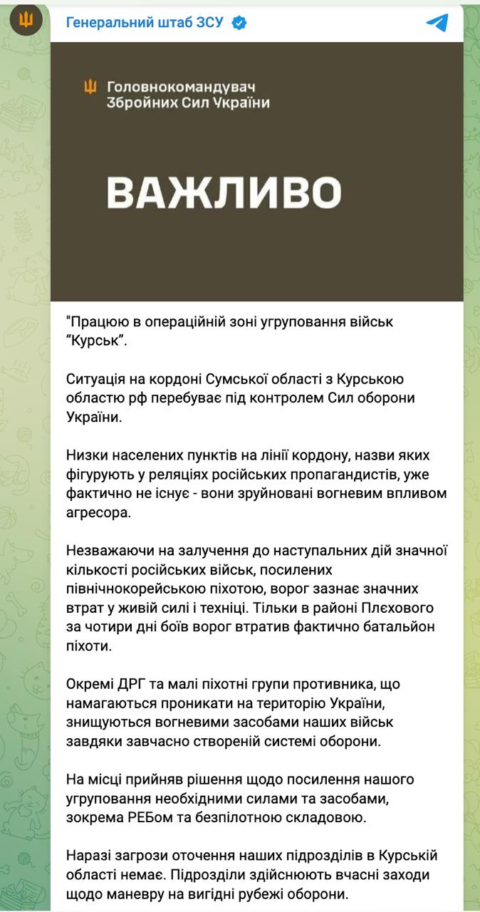 При этом он заверил, что угрозы окружения ВСУ в Курской области нет, а "ситуация на границе Сумской области с Курской областью РФ находится под контролем Сил обороны Украины".